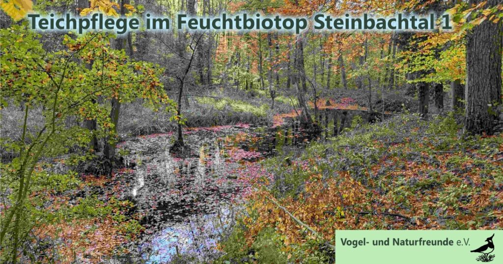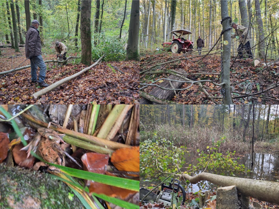 Nachdem vor kurzem bereits der Uferbereich im Feuchtbiotop Steinbachtal 1 gepflegt worden war, widmete sich das Team nun den Teichen. Mit Muskelkraft – und „ein bisschen Hilfe“ durch einen Traktor und eine Motorsäge – wurde das im Wasser liegende Holz herausgezogen. Das ist wichtig, denn wenn Totholz dauerhaft in Teichen liegen bleibt, wird es durch Mikroorganismen und Pilze zersetzt. Dabei verbrauchen diese Sauerstoff, und es gelangen so viele Nährstoffe ins Wasser, dass das Algenwachstum zunimmt und die Teiche schneller verlanden – mit negativen Folgen für Amphibien, Insektenlarven und lichtliebende Wasserpflanzen.